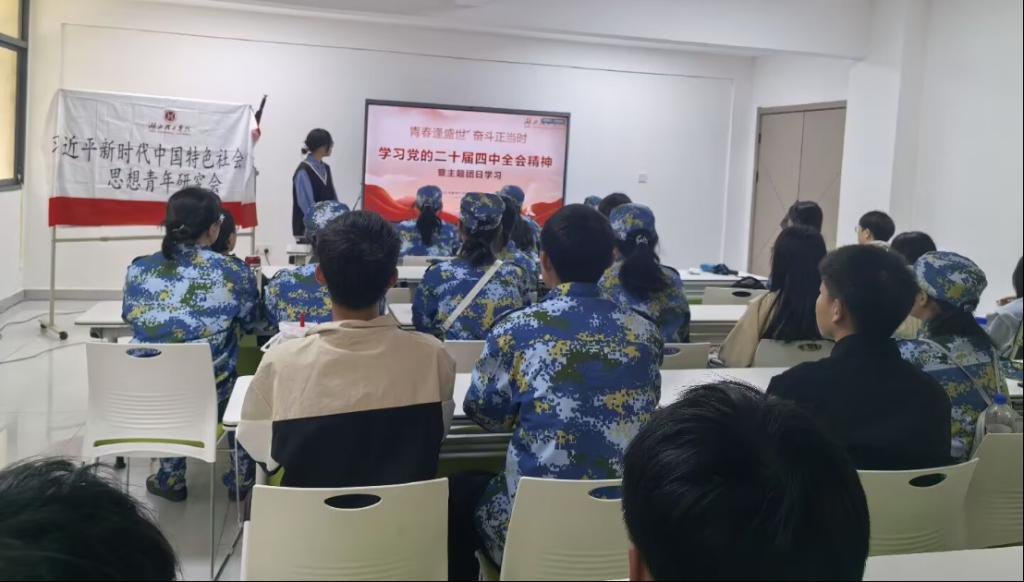本网消息 为深入学习贯彻党的二十届四中全会精神,切实把广大湖理学子的思想和行动统一到党中央决策部署上来,充分发挥学校思想政治类社团的政治引领功能和桥梁纽带作用。11月12日中午,习近平新时代中国特色社会主义思想青年研究会(简称“研究会”)80余名学生在毓成学生公寓求实一站式学生社区102室开展了“学习贯彻党的二十届四中全会精神”专题学习暨团日学习活动。